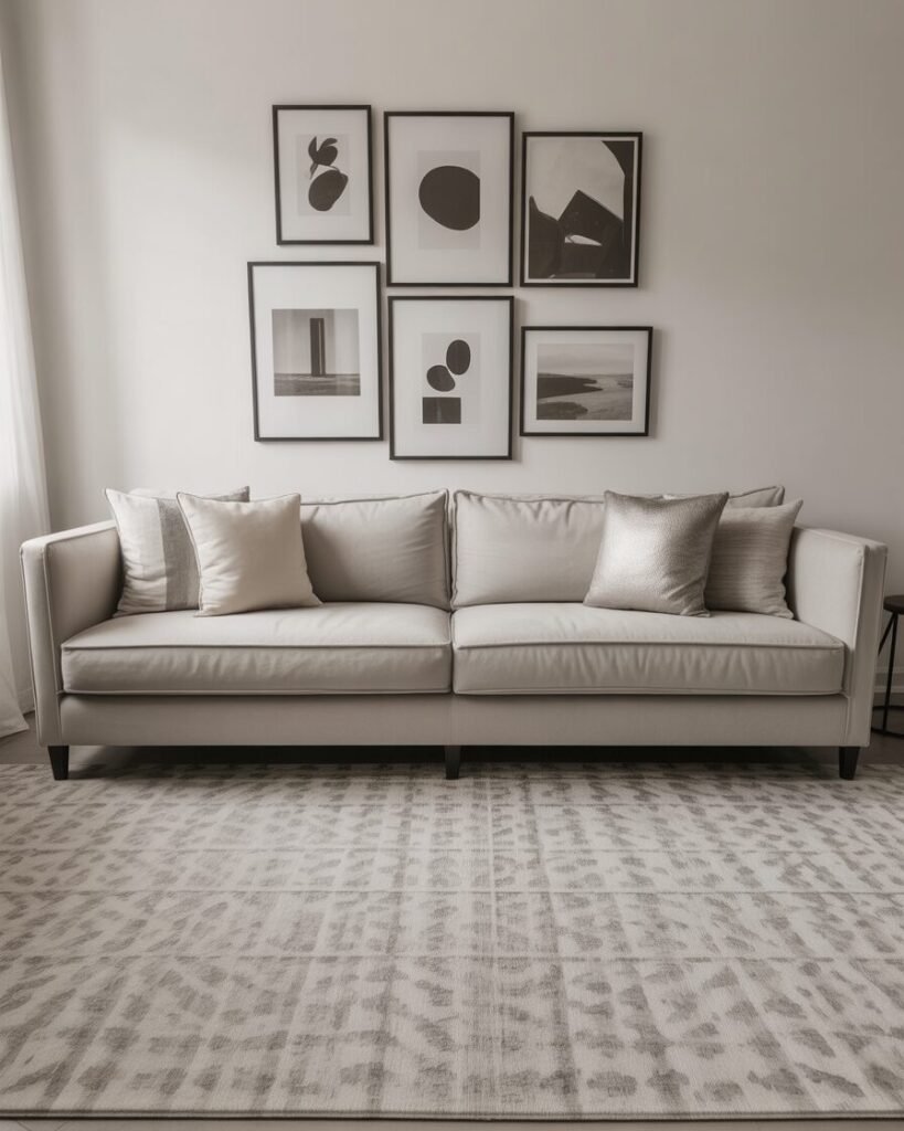 A black-and-white theme with patterned rug and neutral sofa makes a chic base. Add thrifted wall art and budget lighting to keep it affordable.
