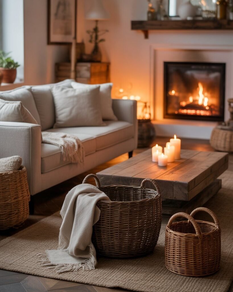 Keep furniture minimal around a styled fireplace. Add affordable candles, woven baskets, and layered rugs for warmth without major expense.