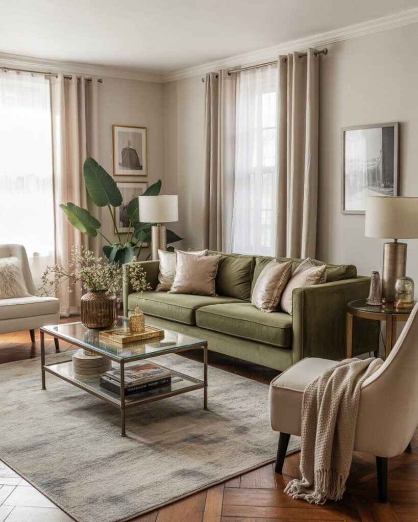 A velvet-look sofa, metallic lamps, and thrifted glass table bring luxury vibes affordably. Use soft neutral curtains and a plush rug for a cozy yet glamorous effect.