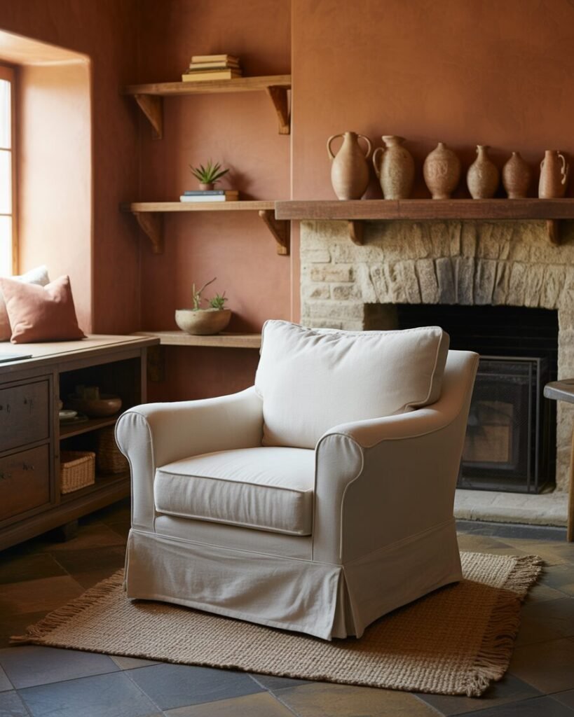 Warm terracotta tones, wooden furniture, and woven rugs create an earthy vibe. Add affordable pottery, soft lighting, and second-hand accent chairs for a rustic charm.