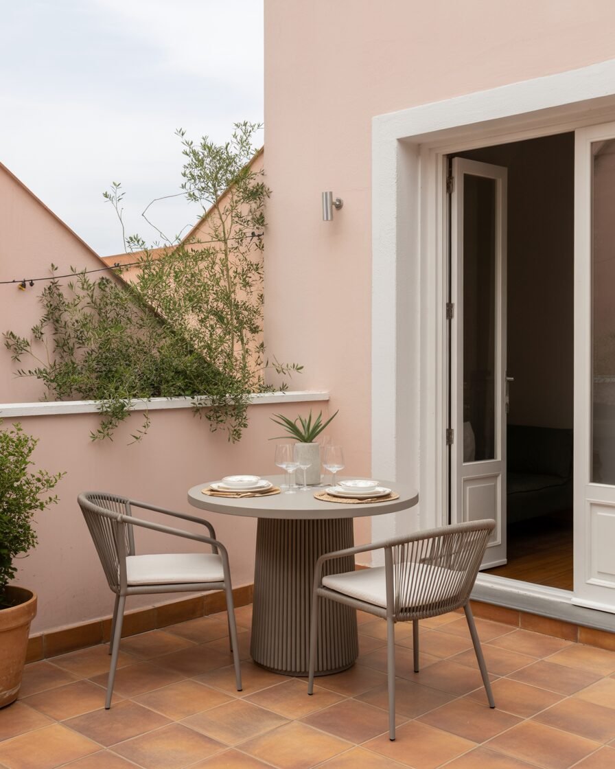 A compact outdoor dining table makes entertaining easy. These exterior terrace balcony design ideas blend function with style for weekend brunches or evening dinners.