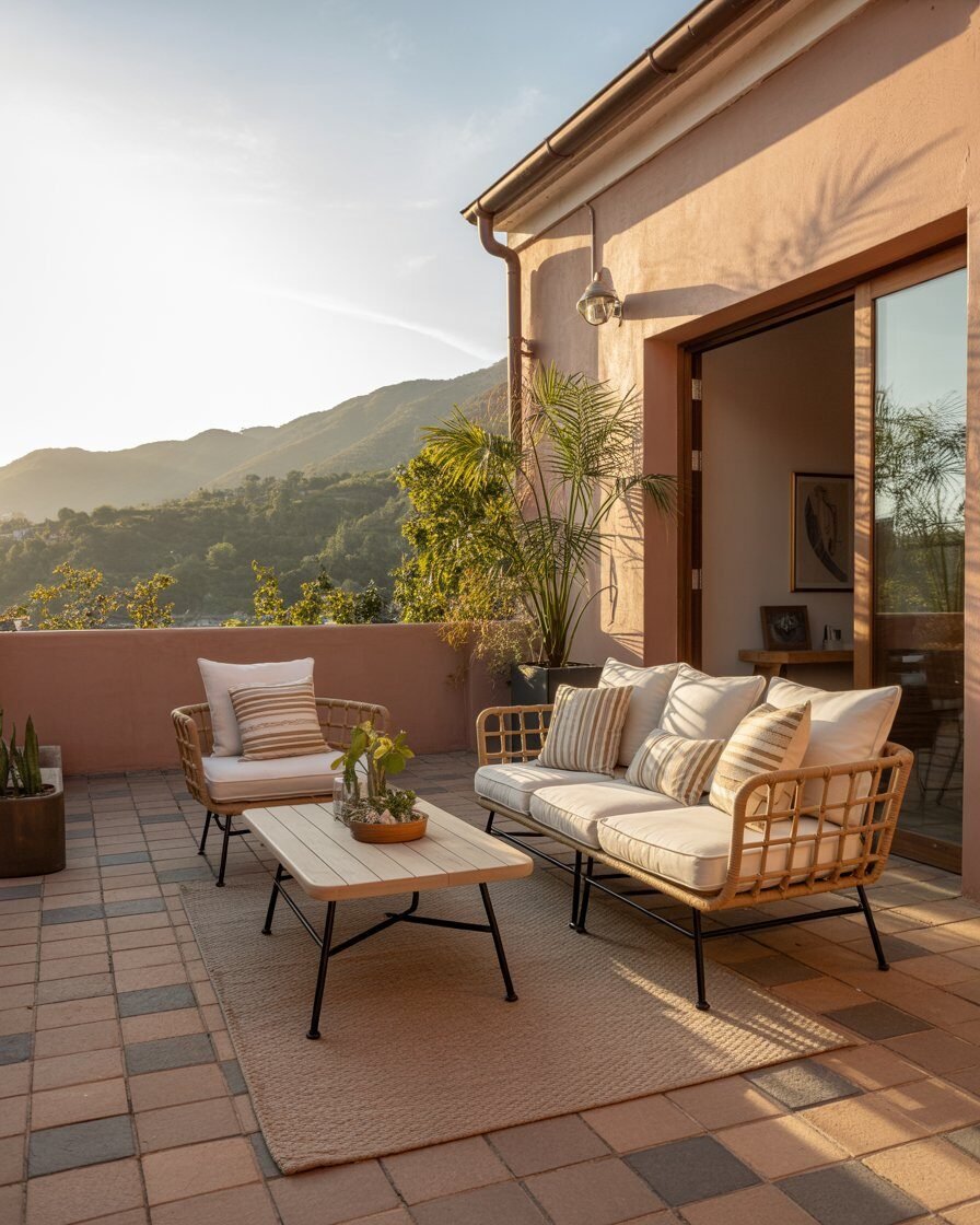 Create a relaxing nook with cushioned seating and low tables. These exterior terrace balcony design ideas make any outdoor space feel like a living room.