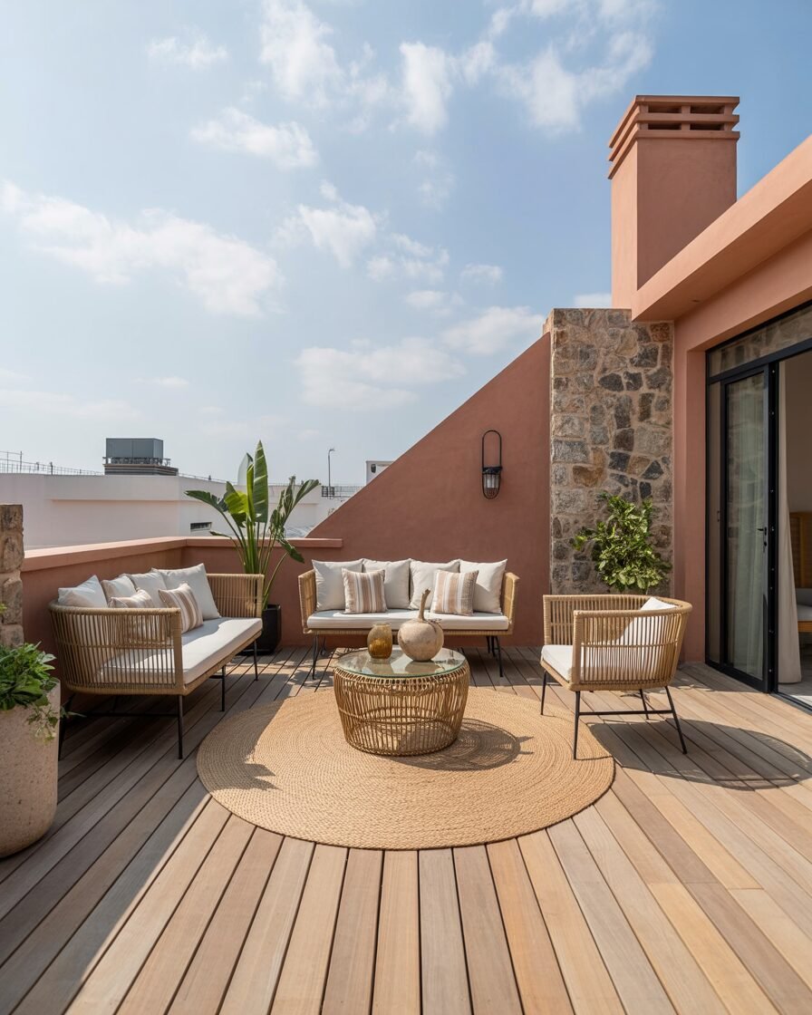Wood, stone, and wicker add warmth. These exterior terrace balcony design ideas connect your outdoor area with nature beautifully.