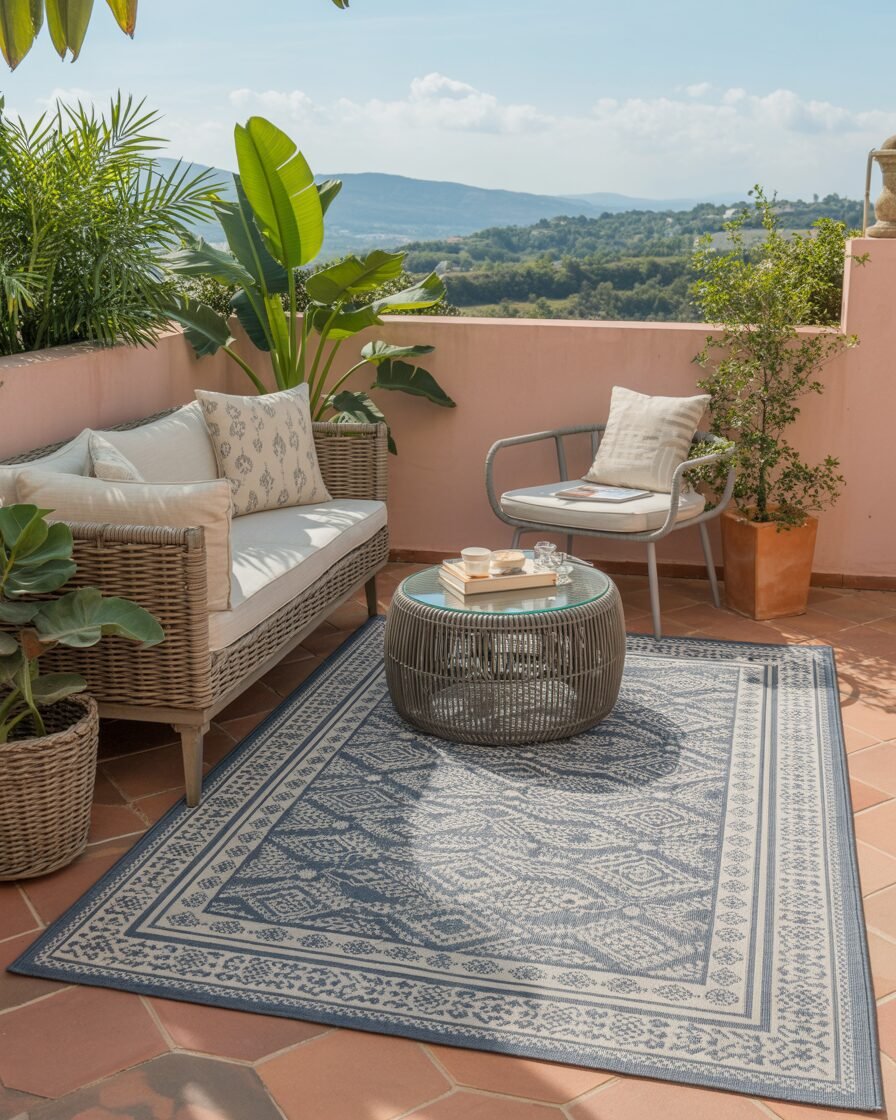 Outdoor rugs define spaces and add texture. These exterior terrace balcony design ideas help make your terrace feel more like an indoor-outdoor room.
