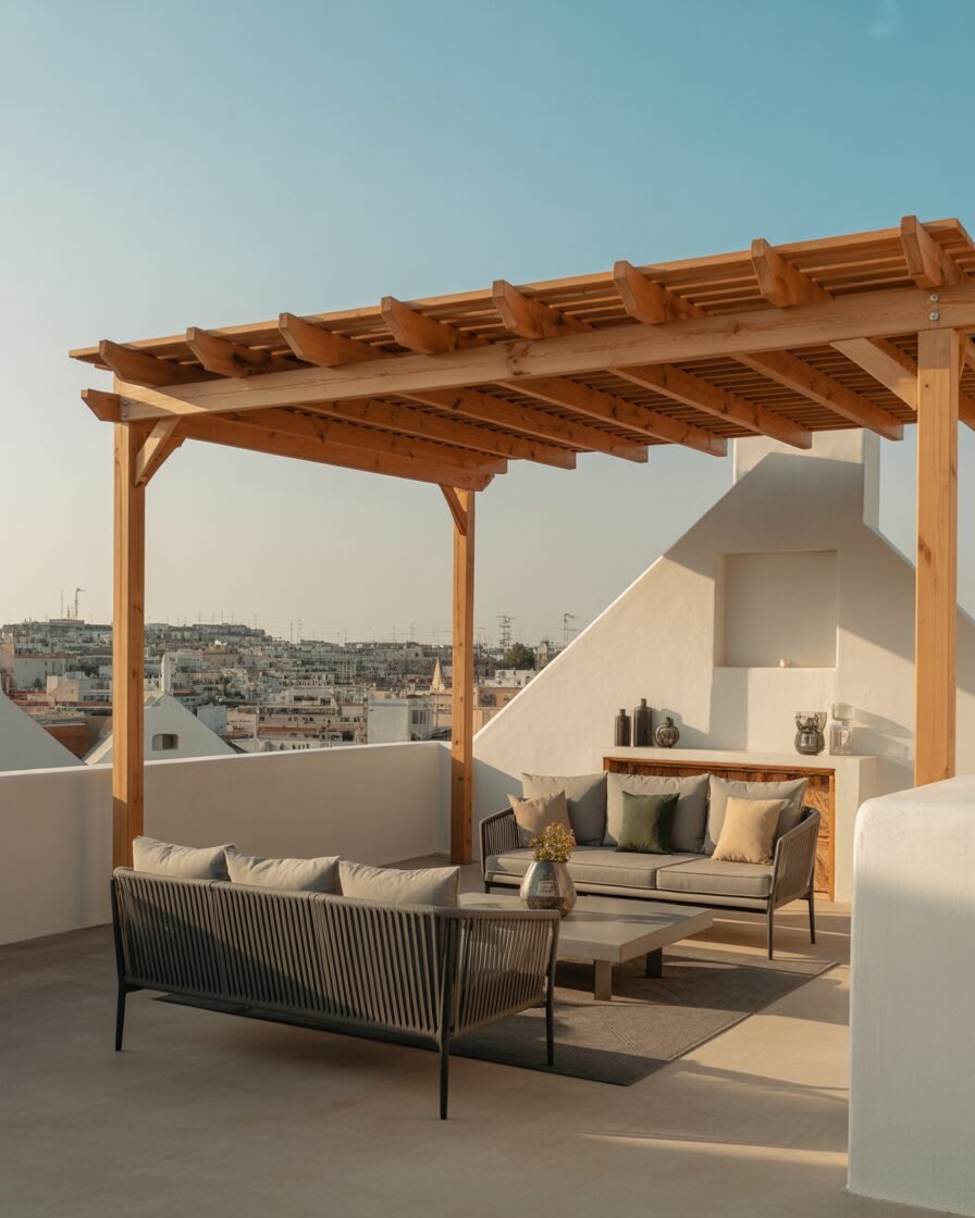 Pergolas offer structure and partial shade. These exterior terrace balcony design ideas combine function with architectural flair.